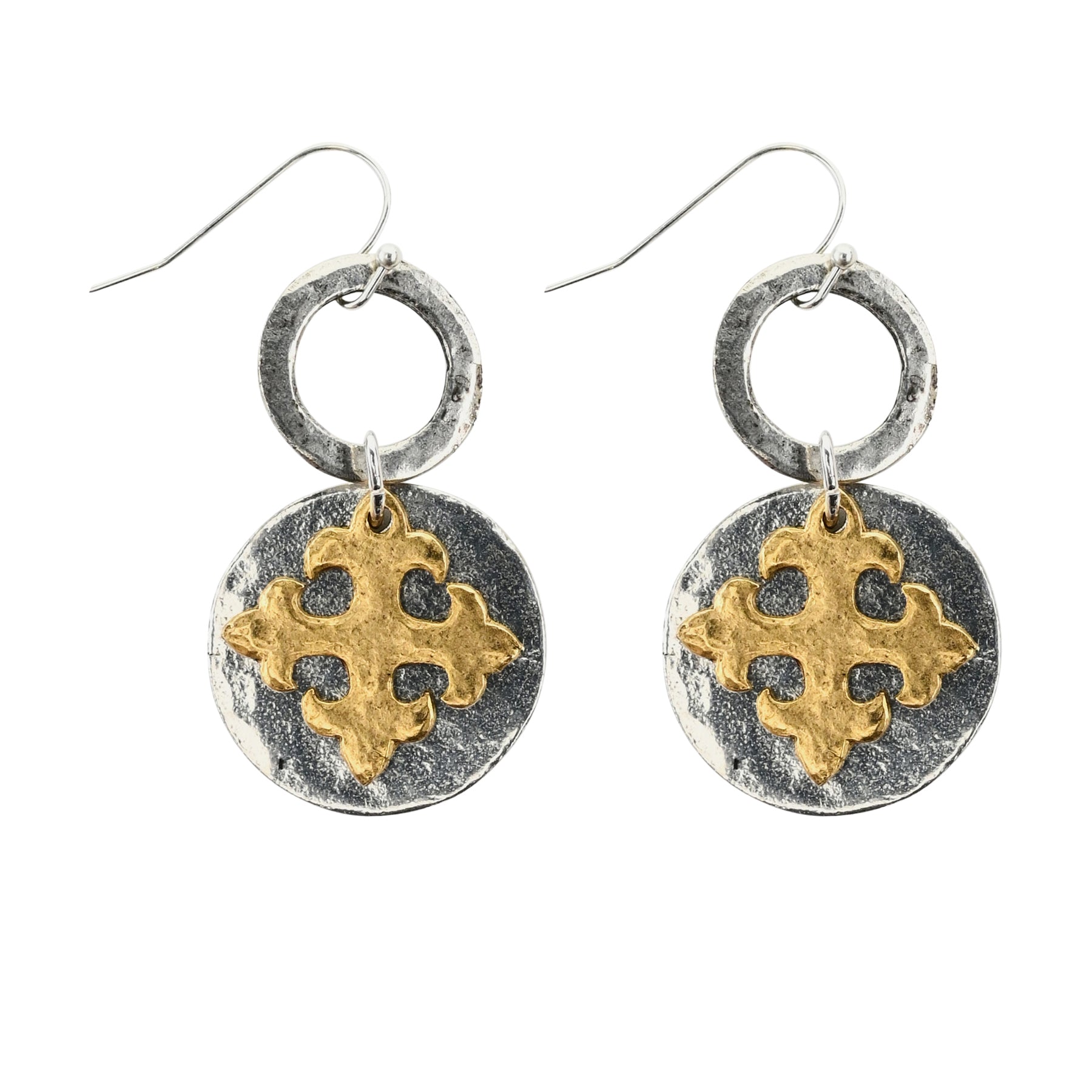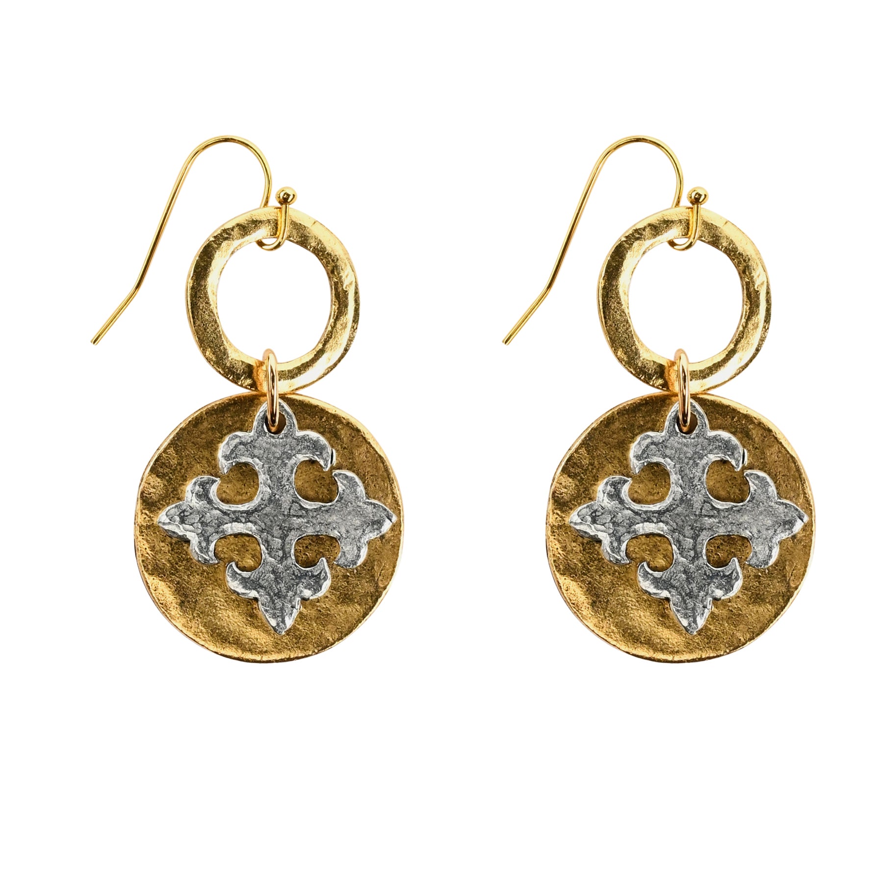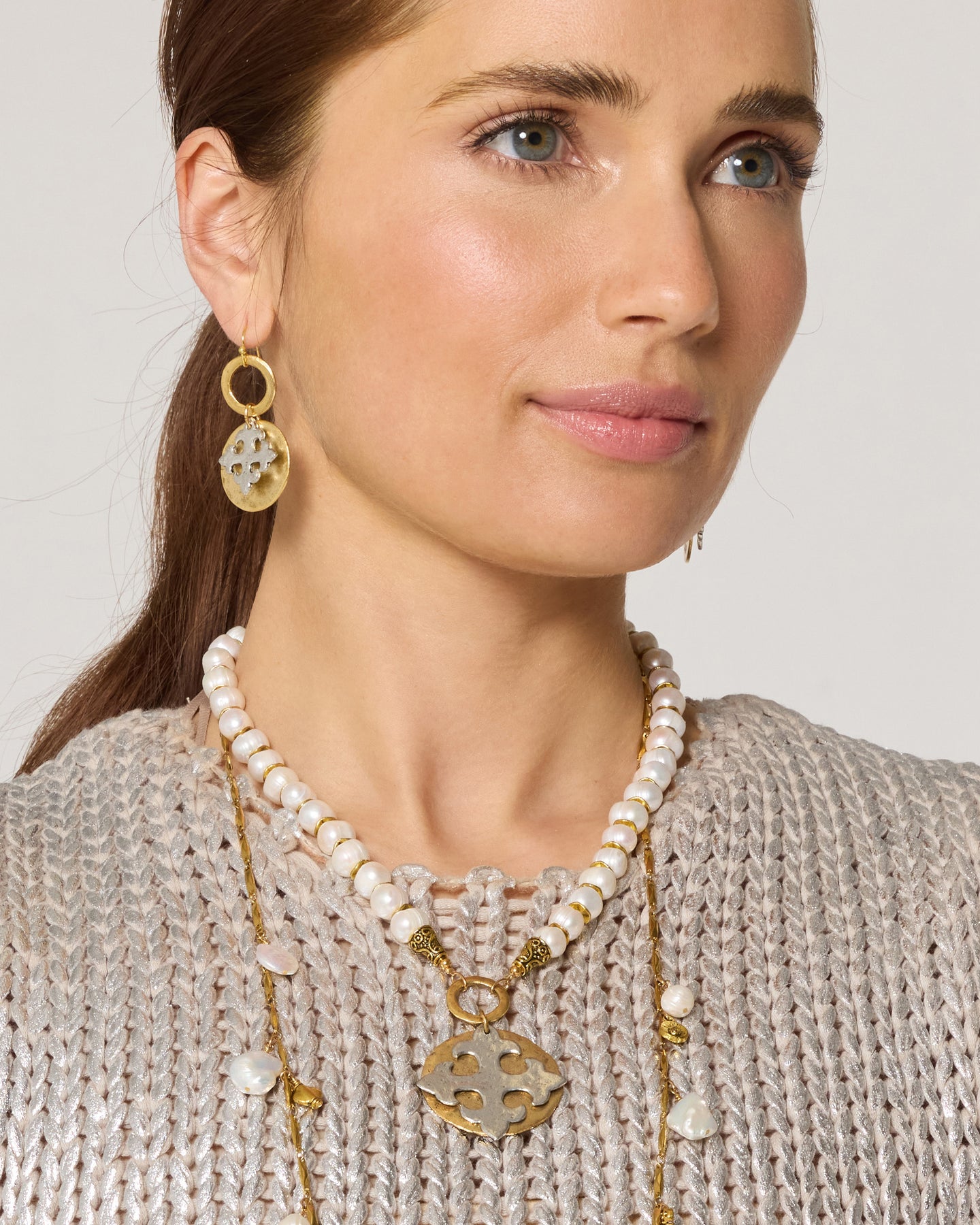 Maltese cross charm is layered with a hammered disk and suspended from an open circle. Complete the look with our Ginsburg Pearl Necklace. Handmade in Texas.