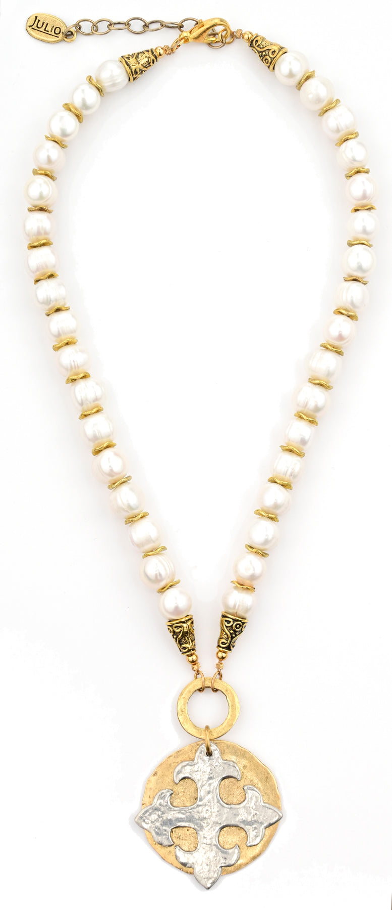 This beautiful Ginsburg necklace contains freshwater pearls with gold spacers and is accented with a large maltese cross layered pendant. Complete the look with our Maltese Cross Hoop Earrings and our Celebes Necklace. Handmade in Texas.
